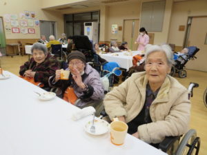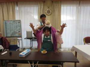 1階2階各ホールにて新年会を行いました。二人羽織、福笑いなどを行い楽しい時間を過ごしていただきました。