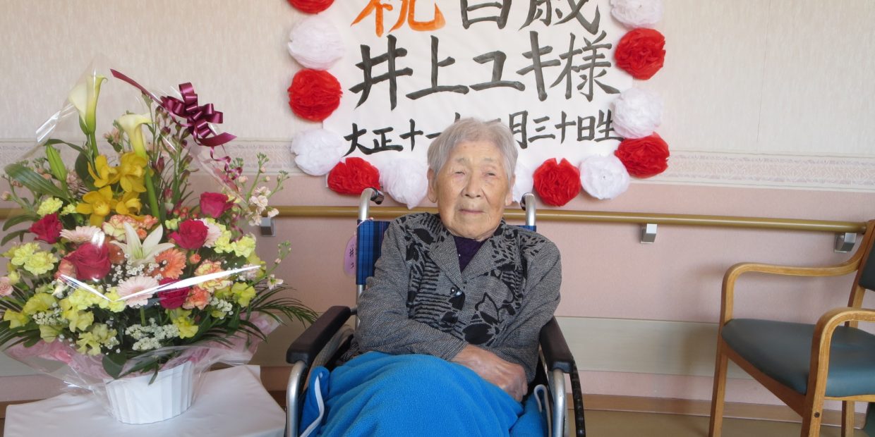 100歳のお祝い by 黒澤幸十郎 Posted on 2022年3月24日2024年2月2日 特養ホーム 井上ユキ様が100歳を迎えられました。おめでとうございます。 小島市長がお越しくださいました。